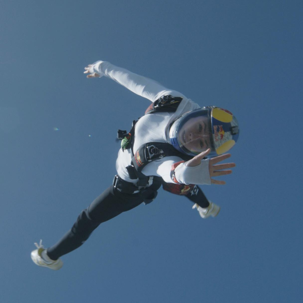La escena parece imposible: el cielo despejado arriba, las nubes formando una especie de alfombra blanca debajo, y ella avanzando con calma. Pero no está flotando. Está en caída libre.